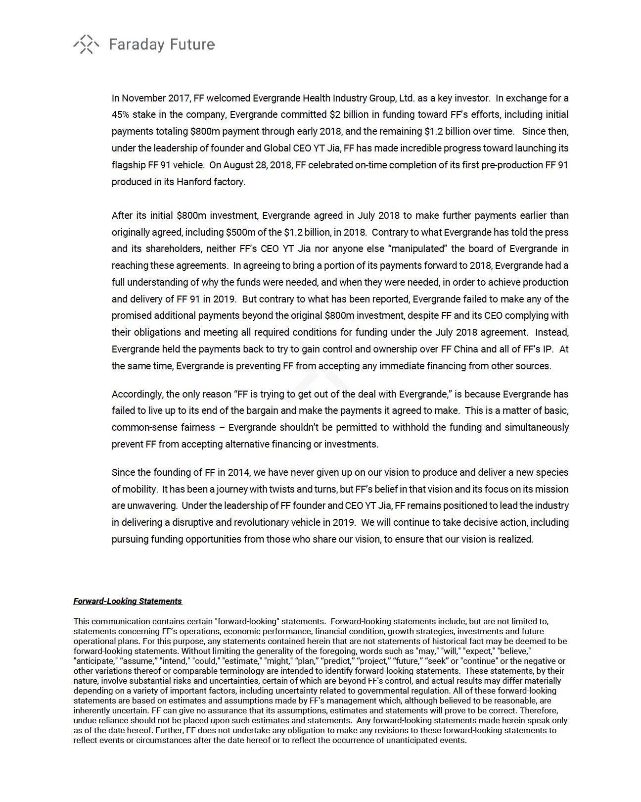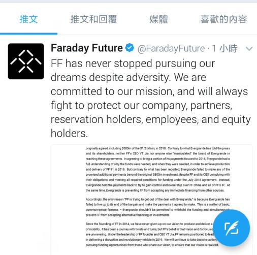 法拉第未來今日發(fā)布聲明稱,試圖擺脫恒大的唯一原因是,恒大沒能夠履行承諾和支付同意的款項。恒大不應(yīng)該一邊扣留款項,一邊阻止FF接受其他投資。